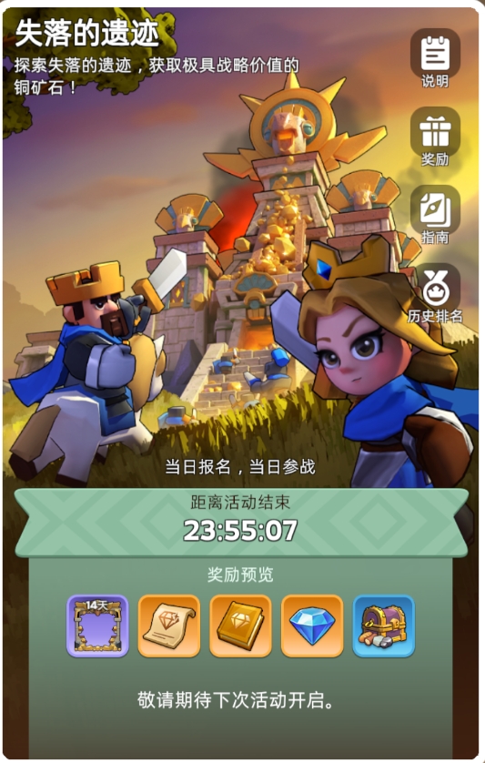 战场等待时间结束后,领主们可自由行动,占领各等级的矿脉,采集铜矿石。此外,矿区内会定期出现矿物储量极高的不稳定矿脉供采集,合理分配出征队伍,方能取得最大收益。每场失落的遗迹探险战斗持续30分钟在活动后期,【失落宫殿】将会开放。活动结束时,将根据占领该建筑的时间长短计算排名,并发放相应的铜矿石作为排名奖励。