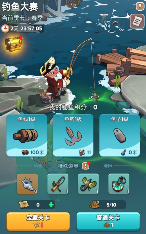 2、宝藏钓鱼:消耗1份藏宝海图,就能带你找到一处有许多珍稀鱼类和深海宝箱的海域。宝藏关卡中的鱼线、鱼钩和鱼坠的属性等同于最高等级。