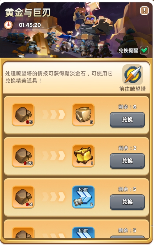 3、可以在【黄金与巨刃】页面换取包括黄金在内的奖励。